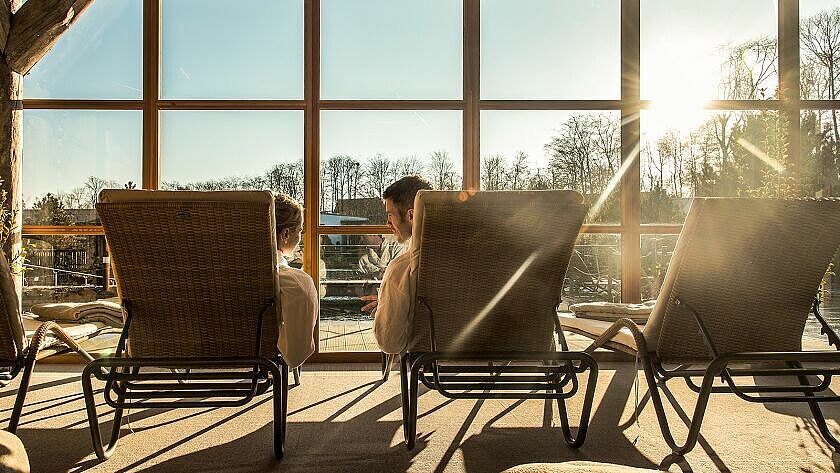 Das Wellneuss bietet seinen Gästen neben Saunen und Abkühlmöglichkeiten auch zahlreiche Ruhezonen zum Entspannen. Ein großer Ruheraum ist mit Wasserbetten und Liegen ausgestattet und bietet einen Rundumblick nach draußen in den Garten. Auch am See lädt ein Liegehaus zum Verweilen ein.