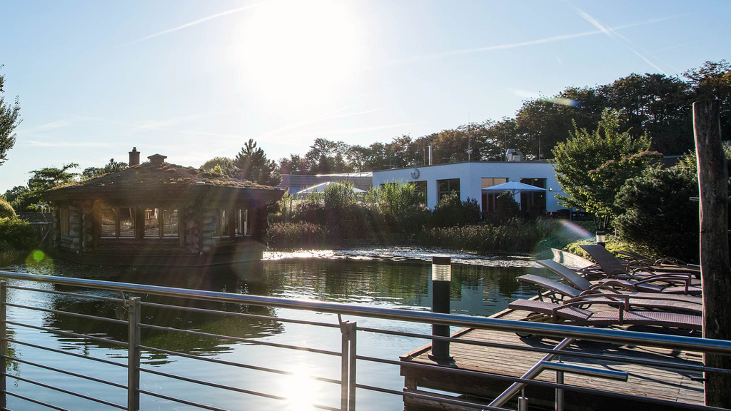 Die Saunen befinden sich sowohl im Innen- als auch im Außenbereich, im Mittelpunkt der gesamten Anlage steht ein Naturbadesee, in dem man sich nach dem Saunagang abkühlen kann.