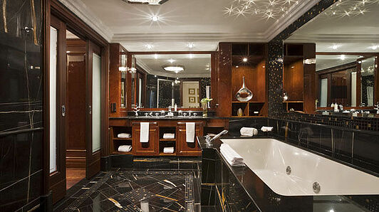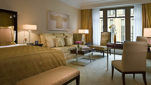 Verantwortlich für die Inneneinrichtung war Peter Silling, der zuvor unter anderem die Ritz-Carlton-Häuser in Berlin und Moskau zum Leben erweckt hat. Silling hat dunkle Hölzer und beige-güldene Farben ausgewählt, die edel wirken und Gemütlichkeit versprühen. Großen Wert legt man auf kleine Details: Jedes Zimmer verfügt über drei Telefone – davon ein tragbares, in den Badezimmerspiegeln sind Fernseher integriert, so dass man auch bei der Morgenkosmetik, beim Regenwald-Duschgang oder beim abendlichen Entspannungsbad nicht auf die Börsennachrichten oder seichtere Unterhaltung verzichten muss.