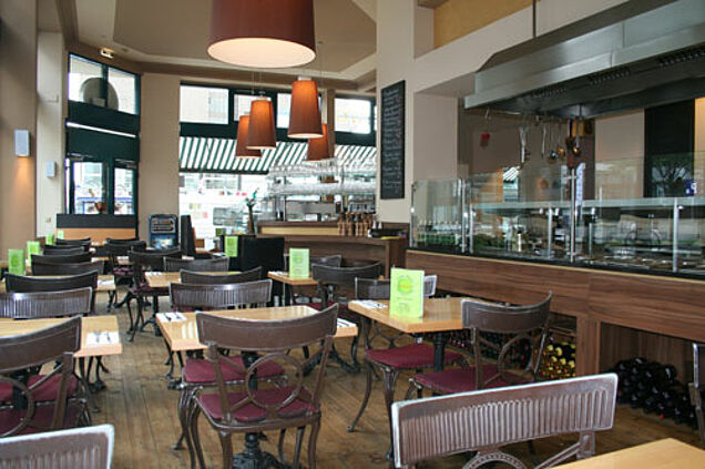 Warme mediterrane Farben sowie kleine italienische Accessoires sorgen für Wohlfühl-Flair in dem Restaurant, das über zwei etwa gleich große Bereiche verfügt, die durch eine Ecke optisch geschickt voneinander getrennt sind. Verbindungsglied ist der Thekenbereich mit der großen offenen Küche. Man kann sich also entscheiden, ob man sich das Treiben auf der Friedrichstraße anschaut oder zusieht, wie die Köche in Rekordzeit die leckeren Pastagerichte zaubern.