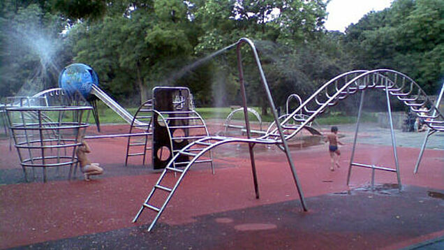 Der Wasserspielplatz ist frei zugänglich, das Wasser fließt allerdings nur tagsüber und nur in den Sommermonaten.