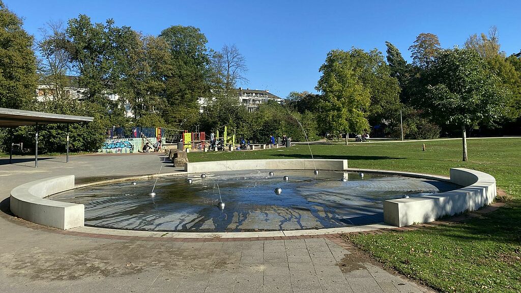 Weiteres Element des Wasserspielplatzes im Zoopark ist ein „Fontänenfeld“, auf dem sich die Kinder bei sommerlichen Temperaturen abkühlen und nass spritzen lassen können. Die Düsen lassen sich durch einen Druck auf die Wasser-Taste am angrenzenden Technik-Gebäude aktivieren. Spätestens dann heißt es „Wasser kommt!“