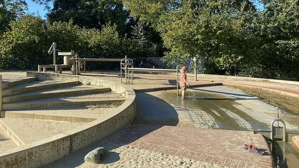 Auf dem Wasserspielplatz im Zoopark fühlen sich vor allem kleine Bau- und Matschmeister wohl. Im Gegensatz zu den Wasserspielplätzen in Bilk oder im Schlosspark Eller, wo es zahlreiche wasserspeiende Kletter- und Spielgeräte gibt, liegt der Schwerpunkt in Düsseltal auf der kreisrunden Wasser-Matsch-Landschaft, die sich über mehrere Ebenen bis zu einem unten liegenden Sandkasten erstreckt.