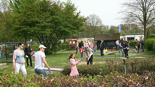Der recht kleine, aber nett angelegte Unterbacher Minigolf-Platz mit seinen 18 Bahnen liegt auf der Nordseite des Unterbacher Sees in unmittelbarer Nähe des Campingplatzes. Die Zufahrt erfolgt über den Kleinen Torfbruch, wo man auch parken kann. Schläger und Bälle gibt es an der Rezeption des Campingplatzes Nord.