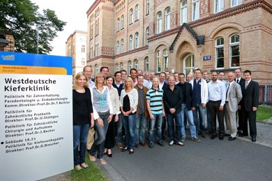 Gute Stimmung: Die Studienteilnehmer des ersten Masterstudienganges Endodontologie. V.r.: Dekan Prof. Dr. Joachim Windolf, Dr. David Sonntag, Koordinator des Studienganges und Prof. Dr. Wolfgang H.-M. Raab, Initiator und Klinikdirektor. Foto: HHU
