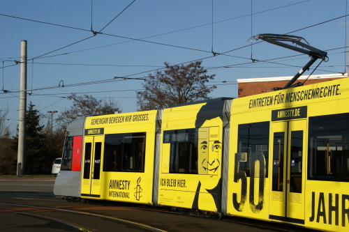 Eine Straßenbahn des neuesten Modells (NF8U) wurde von innen und außen von der Düsseldorfer Amnesty Gruppe 1483 und der Kommunikationsdesignerin Jana Stenzel unter dem Motto „Denkmal an die Menschenrechte“ umgestaltet. Sie fährt sie ab sofort als ein mobiles Denkmal an die Menschenrechte durch Düsseldorf und soll Düsseldorfer sowie nationale und internationale Gäste an die hohe Bedeutung der Freiheit erinnern.