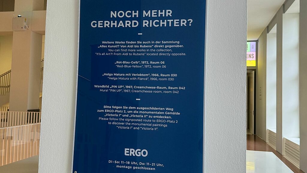 Am Ende der Ausstellung sollte man sich die beiden überdimensionalen Werke „Viktoria I“ und „Viktoria II“ im Foyer des benachbarten ERGO-Gebäudes nicht entgehen lassen. Sie wurden von Richter in den 80er Jahren im Auftrag der Victoria Versicherung, der heutigen ERGO, für den Empfangsbereich gemalt. Da sie zu groß sind, um aus dem Gebäude in den Kunstpalast transportiert zu werden, können sie nun während der gesamten Ausstellungsdauer zu den üblichen Öffnungszeiten des Kunstpalastes kostenlos im ERGO-Gebäude besichtigt werden. Wegschilder führen die Besucher:innen dorthin.
