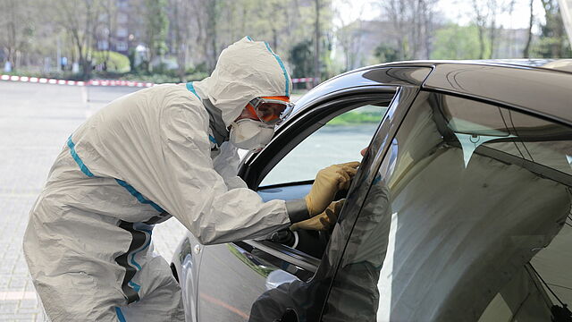 "Das Prinzip gleicht dem eines Drive-In-Schnellstrestaurants. Personen, die über die städtische Hotline einen Termin bekommen haben, fahren mit ihren Fahrzeugen den Parkplatz vor der Veranstaltungshalle an der Siegburger Straße 15 an", erklärt Thomas Hußmann von der Feuerwehr Düsseldorf. Dort melden sie sich an einem Schalter wie in einer Arztpraxis an. Nachdem die Personalien und die Terminvergabe geprüft wurden, werden die Pkw zu einer der drei eingerichteten Fahrspuren geleitet. Die Abstriche werden dann unter Pavillons durch entsprechend eingewiesenes und geschultes Personal genommen, ohne dass die Fahrerin bzw. der Fahrer aus dem Fahrzeug aussteigen muss.