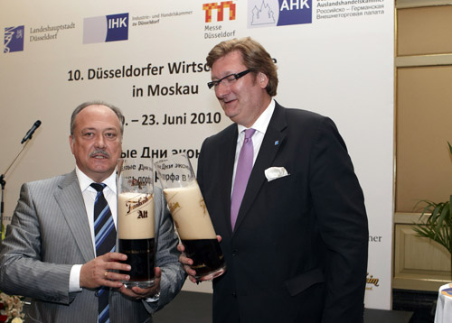 Höhepunkt der Jubiläumsveranstaltung war der "Düsseldorf-Abend" in Moskau, zu dem 200 Gäste aus Politik und Wirtschaft geladen wurden. Gemeinsam stießen OB Elbers und Moskaus Vize-Oberbürgermeister Juri V. Rosljak mit Altbier auf die stabile und fruchtbare Partnerschaft, die zwischen den beiden Städten gewachsen ist, an. Die vertrauensvolle Zusammenarbeit soll zur Unterstützung wirtschaftlicher Kooperationen, aber auch mit Blick auf den kulturellen und sportlichen Austausch weiter ausgebaut werden.