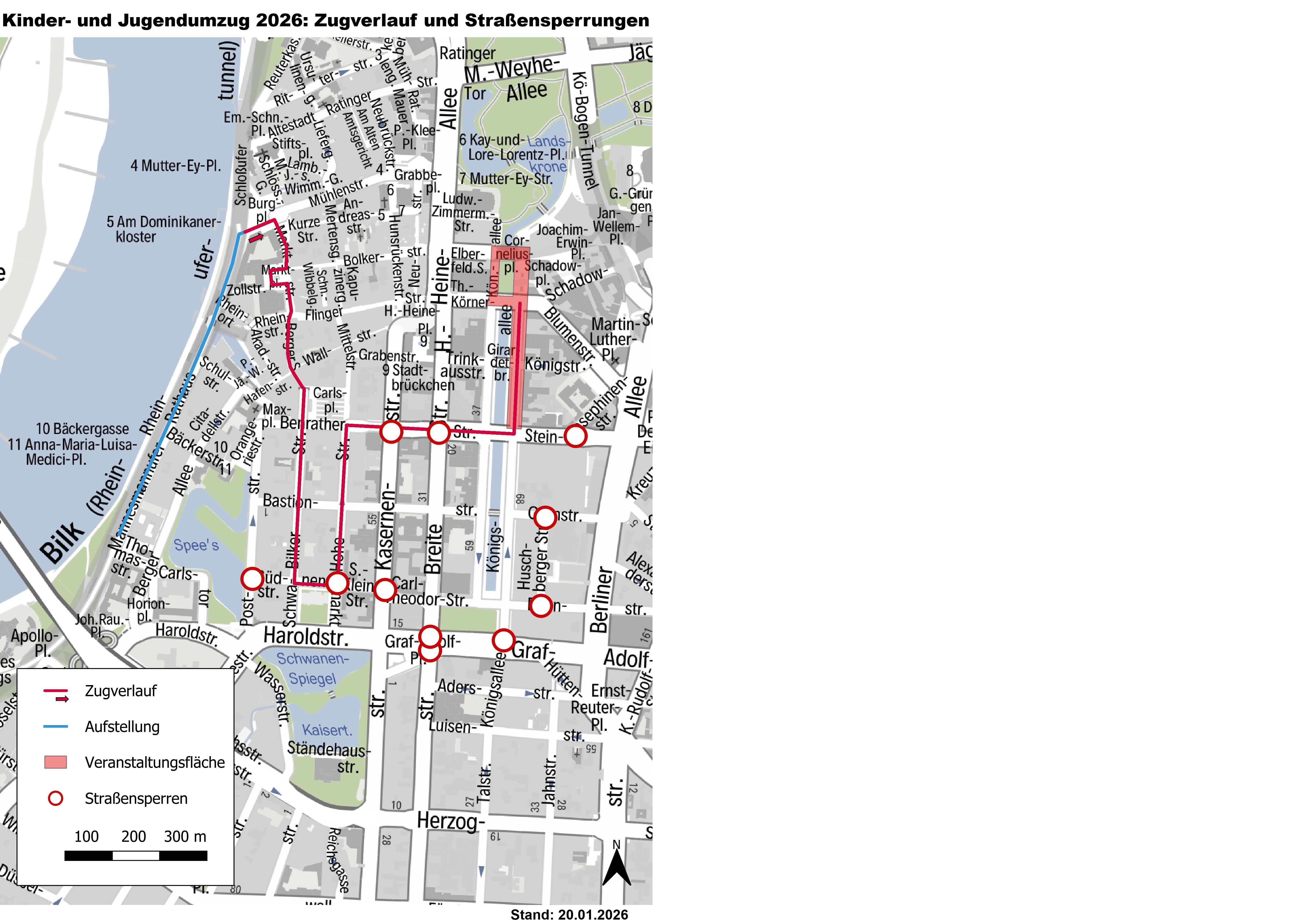 Die Sperrungen für den Kinder- und Jugendumzug beginnen am 14. Februar gegen 12:00 Uhr. Der Zug führt vom Rheinufer durch Altstadt und Carlstadt bis zur nördlichen Königsallee. Umfahrungen sind unter anderem über den Rheinufertunnel, die Berliner Allee und den Kö-Bogen-Tunnel möglich. Die Freigabe der Straßen erfolgt in Abstimmung mit der Polizei und abhängig vom Besucheraufkommen.