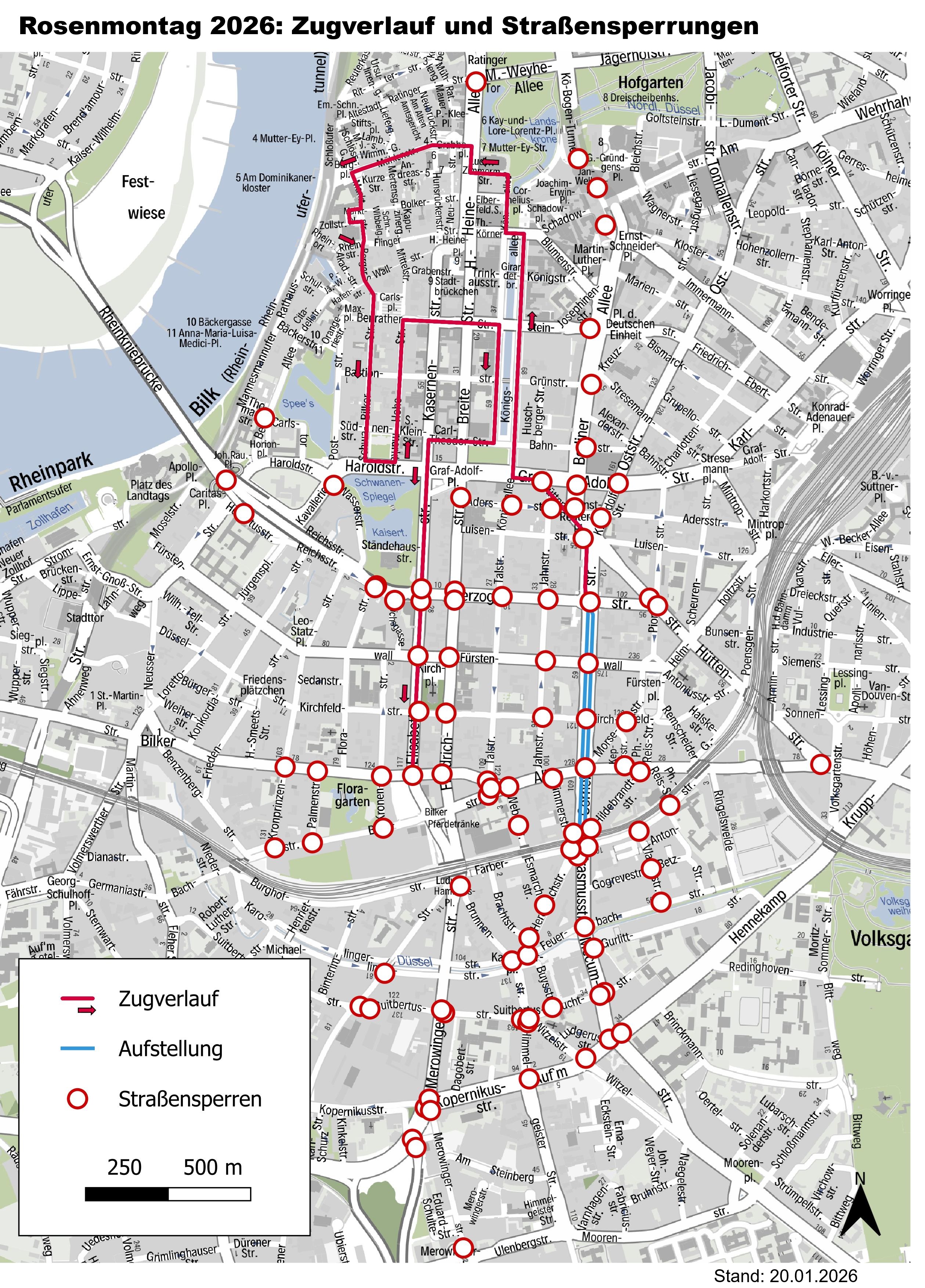 Die umfangreichsten Verkehrseinschränkungen treten am Rosenmontag, dem 16. Februar, in Kraft. Bereits ab 6:15 Uhr beginnen die ersten Sperren für den Transport der Mottowagen. Ab 6:30 Uhr folgen weitere Sperrungen rund um den Aufstellbereich des Zuges, unter anderem am Kö-Bogen-Tunnel. Die dritte Phase startet ab 8:30 Uhr und umfasst die gesamte Zugstrecke vom Norden der Altstadt bis in den Süden der Innenstadt. Auch der Rheinalleetunnel ist zeitweise gesperrt.