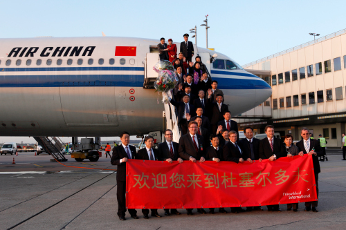 Begrüßt von einer Wasserfontäne der Flughafenfeuerwehr, landete der Erstflug aus Peking Sonntagabend am Düsseldorfer Airport. Der nordrhein-westfälische Wirtschafts- und Verkehrsminister Harry K. Voigtsberger, Düsseldorfs Oberbürgermeister Dirk Elbers, der chinesische Generalkonsul aus Frankfurt Wen Zhenshun und die Flughafengeschäftsführer Christoph Blume und Thomas Schnalke hießen die Passagiere willkommen, darunter eine hochrangige Delegation aus Vertretern der Fluggesellschaft und der chinesischen Wirtschaft. Gemeinsam mit Tan Zihihong, Head of Delegation von Air China, eröffneten sie anschließend die neue Verbindung nach Peking.