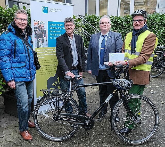 (v. l.) Amtsleiter Harald Wehle, Holger Lorenz von Rotrunner, Michael Müller und Beigeordneter Andreas Meyer-Falcke bei der Zustellung des neuen Personalausweises per Fahrrad, (Foto: Landeshauptstadt Düsseldorf / Michael Gstettenbauer)