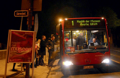 Die meisten der über 40 Ziele wird das Publikum zu Fuß erobern. Es gibt jedoch auch einen Bus-Shuttle, der auf drei Routen die Veranstaltungsorte verbindet und die Besucher von Haus zu Haus bringt. Im Ticketpreis für die "Nacht der Museen" (einmalig zwölf Euro) ist die Nutzung der Busse inklusive. Eintrittskarten und das Programmheft sind in den Museen und Veranstaltungsorten sowie bei den bekannten Vorverkaufsstellen und bei d:ticket erhältlich. Weitere Informationen sowie das Programmheft zum Download gibt es im Internet unter www.nacht-der-museen.de.