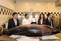 Auch wenn der Rhein die Heimat vieler Fische ist, so findet ein 197 Kilogramm schwerer Thunfisch doch eher selten den Weg in den Düsseldorfer Medienhafen. Am Montag war es jedoch so weit.