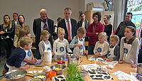 Minister Johannes Remmel und TV-Moderator "Checker Can" lassen sich von kleinen Köchen der Düsseldorfer Gerhard-Tersteegen-Grundschule in die Welt der Milch entführen