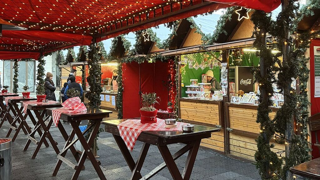 Dank des überdachten Aufenthaltsbereichs lässt sich der Markt auch bei schlechtem Wetter entspannt genießen – ideal für einen gemütlichen Glühwein zwischendurch.